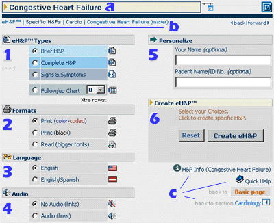 The Specific H&P below shows the master page (see letter b) of the Congestive Heart Failure H&P (letter a).