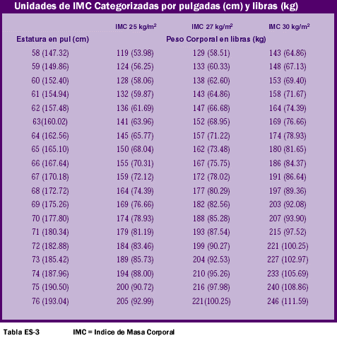 Encuentra tu Estatura -columna izquierda-, luego encuentra los Pesos correspondientes a un IMC de 25, 27 y 30 en la misma línea bajo las columnas IMC25, IMC27 y IMC30 respectivamente.